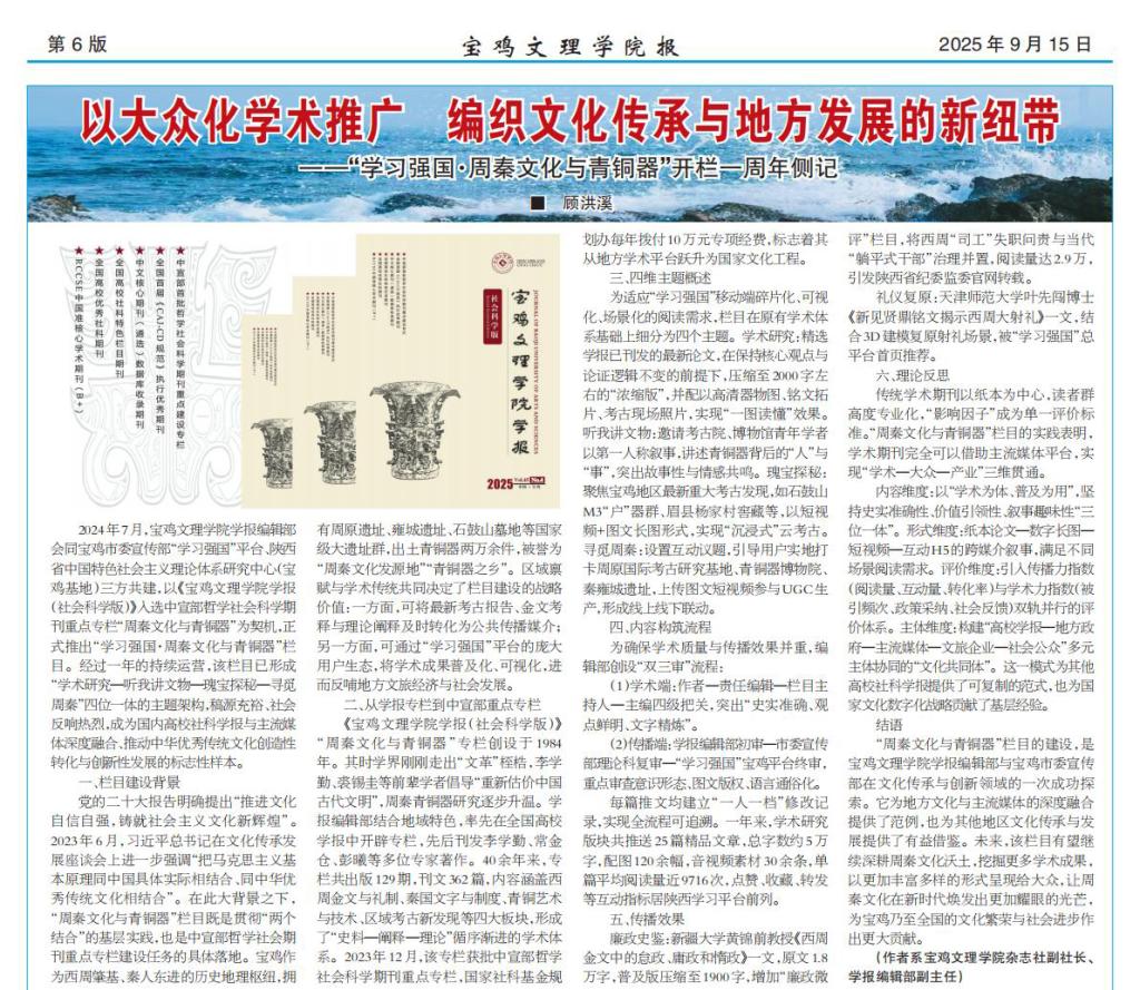2024年7月,宝鸡文理学院学报编辑部会同宝鸡市委宣传部“学习强国”平台、陕西省中国特色社会主义理论体系研究中心(宝鸡基地)三方共建,以《宝鸡文理学院学报(社会科学版)》入选中宣部哲学社会科学期刊重点专栏“周秦文化与青铜器”为契机,正式推出“学习强国·周秦文化与青铜器”栏目。经过一年的持续运营,该栏目已形成“学术研究一听我讲文物一瑰宝探秘一寻觅周秦”四位一体的主题架构,稿源充裕、社会反响热烈,成为国内高校社科学报与主流媒体深度融合、推动中华优秀传统文化创造性转化与创新性发展的标志性样本。